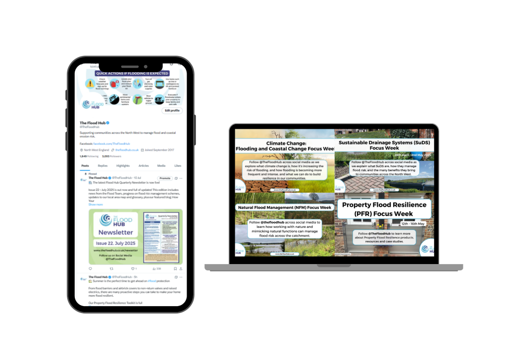 We have a wealth of experience in creating flood resilience content for both websites and social media. We are the people‘ behind The Flood Hub website, regularly writing content and creating resources, as well as the daily management of The Flood Hub People’s and The Flood Hub’s X, Facebook, LinkedIn and BlueSky accounts. Content creation is a service we offer both in the North West and nationwide.